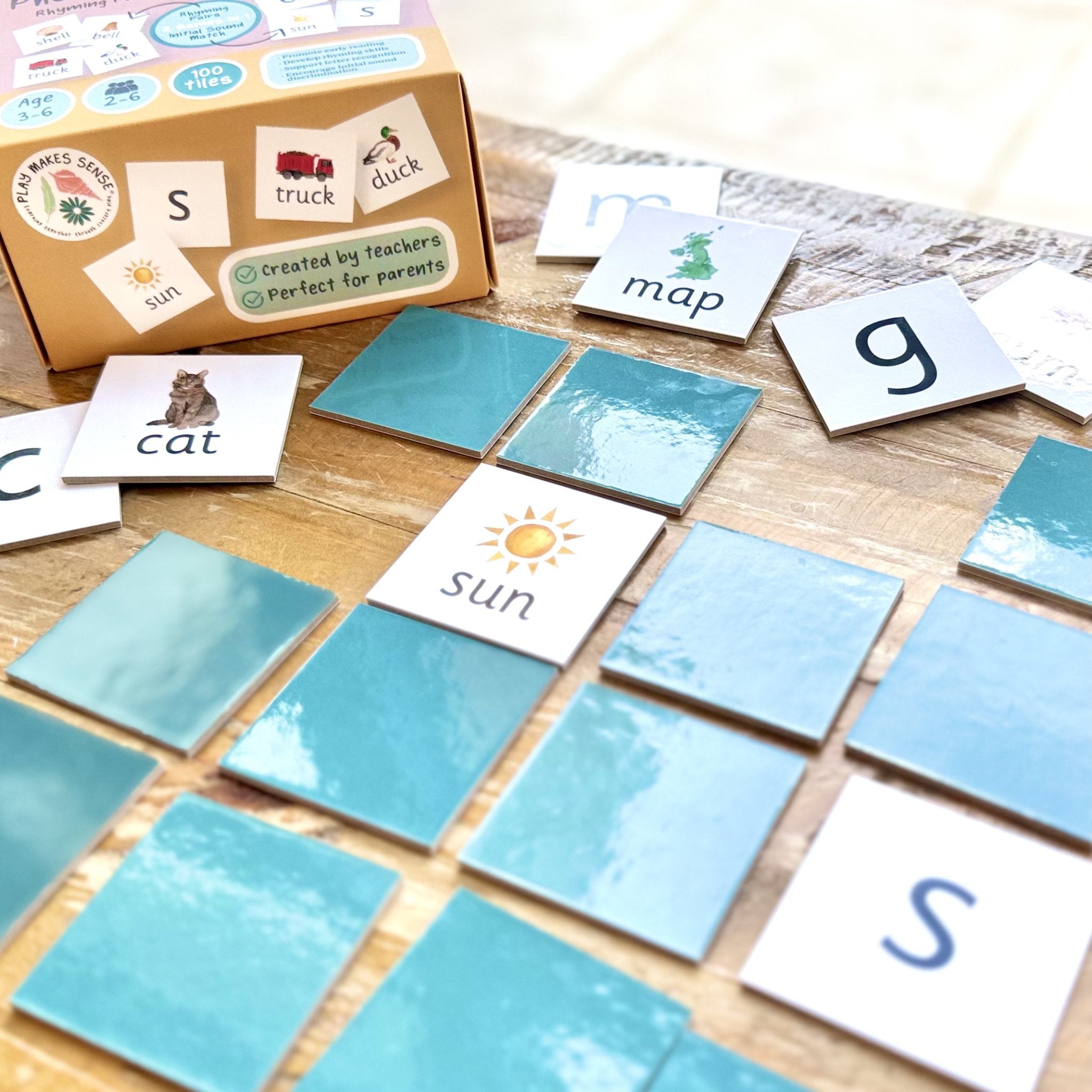 Every tile has been thoughtfully designed with hand painted watercolour illustrations to spark children’s imagination. The words are written in a clear handwriting font, following correct letter formation, making it easy for children to recognise and practise their sounds.